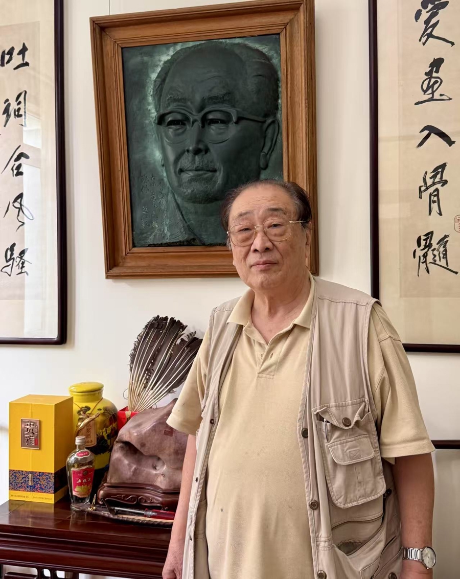 今年83岁的唐逸览家中悬挂着父亲唐云的雕像 陈俊珺 摄